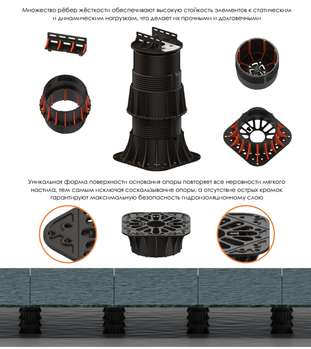 Такие опоры применяются для быстрого и надежного монтажа уличных террас, беседок, площадок у бассейна, фальшпола и других конструкций, не требующих фундамента.