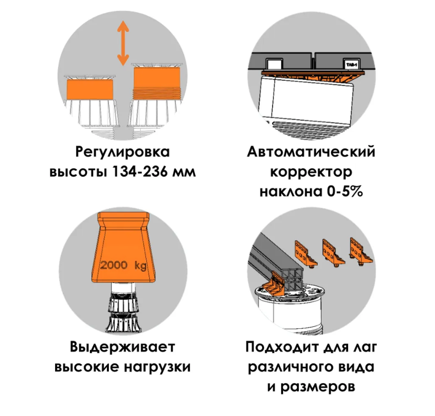 Регулируемая опора – это специальное изделие, изготовленное из высокопрочного полипропилена, с невероятной несущей способностью до 2000 кг на одну опору.